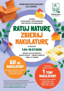 Wydział Gospodarki Odpadami Urzędu Miasta i Gminy Piaseczno zaprasza szkoły podstawowe z terenu gminy Piaseczno do wzięcia udziału w III edycji konkursu „Ratuj naturę – zbieraj makulaturę”. Zbiórka makulatury będzie trwała w terminie od 01.04.2026 r. – 10.07.2026 r.